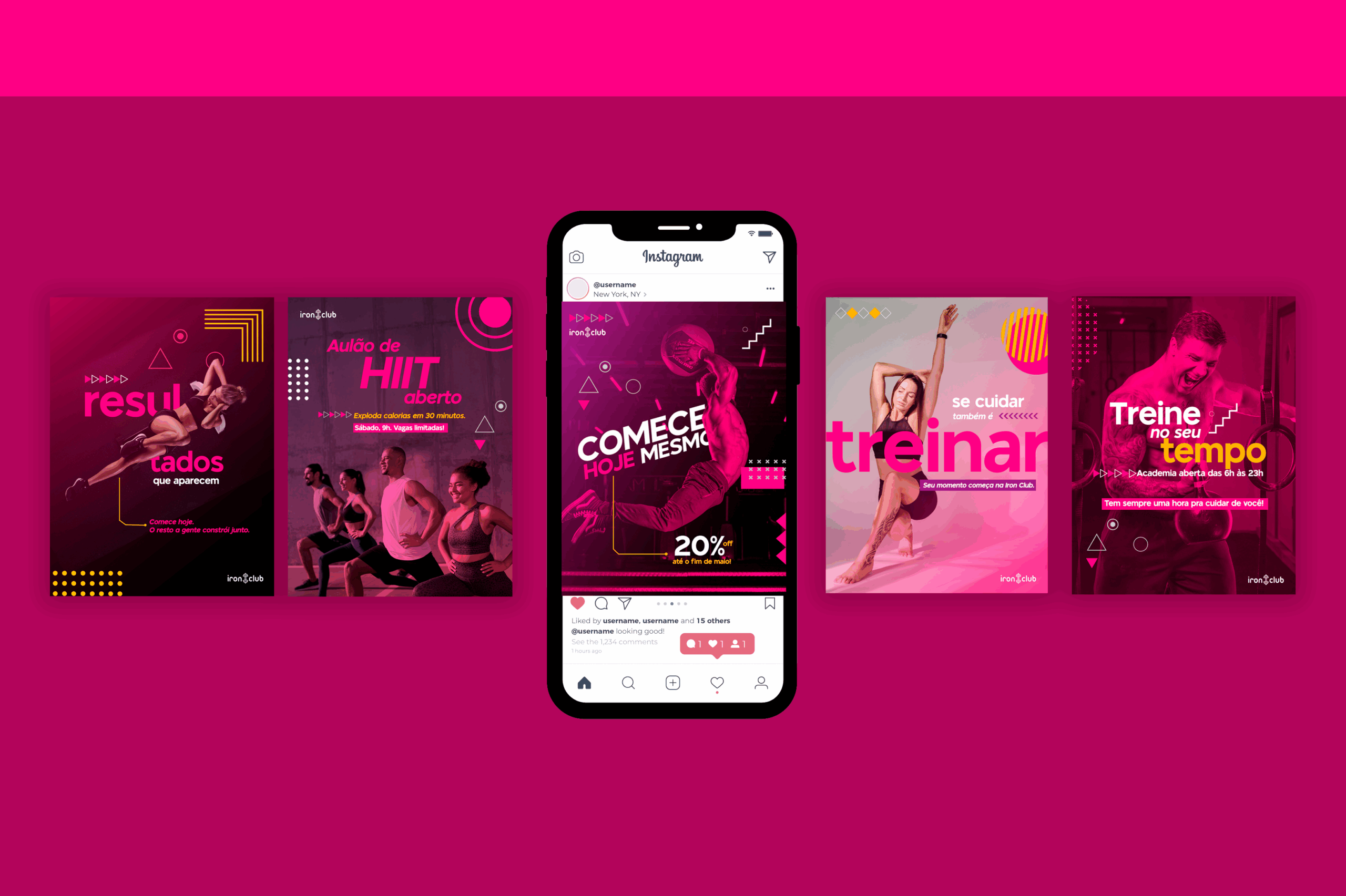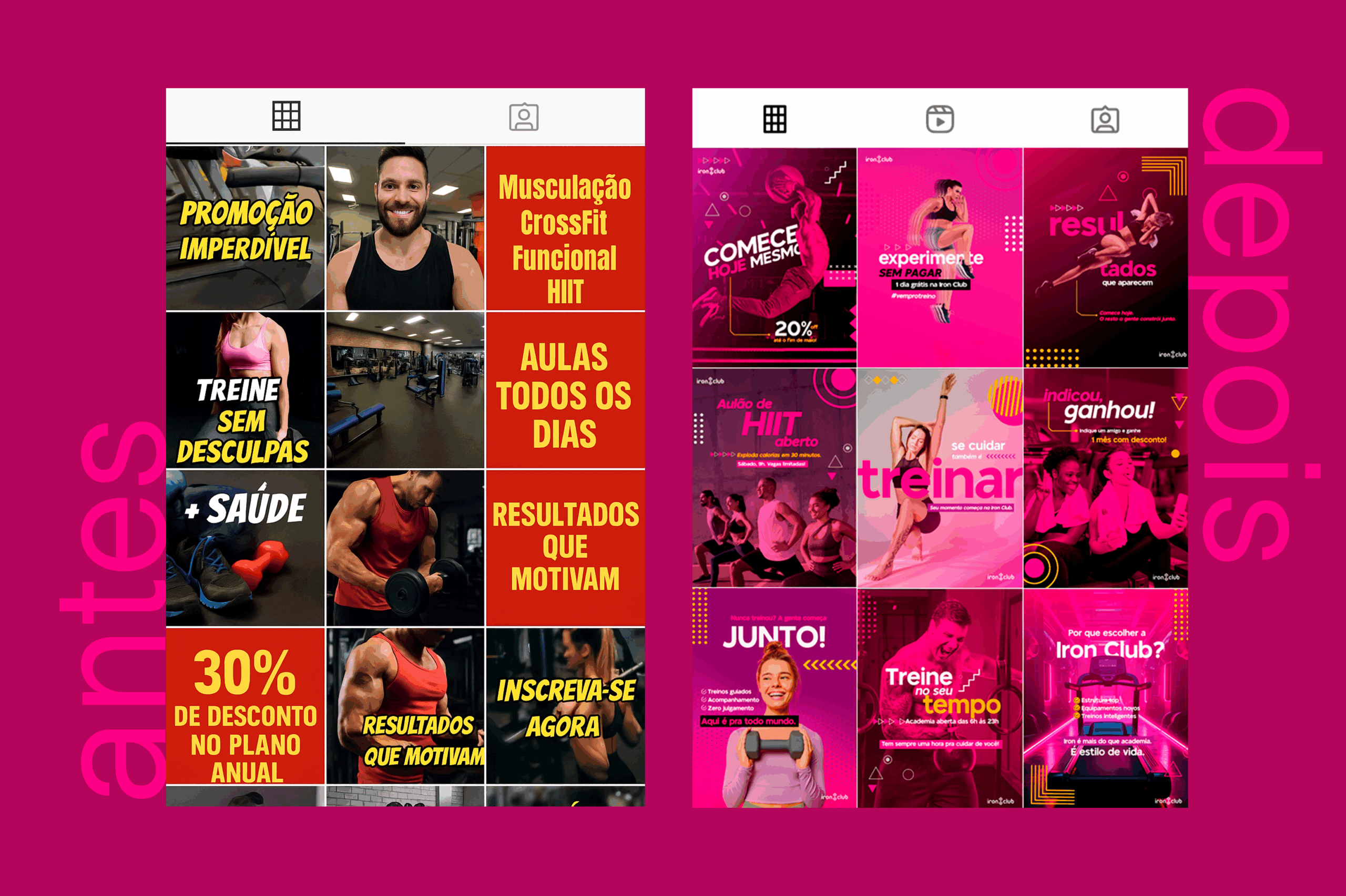 Transformamos completamente o perfil da academia Iron Fit no Instagram. Saímos de um feed desorganizado, com posts sem unidade visual, sem estratégia de conteúdo e com baixo apelo de marca — para uma presença digital forte, coerente e visualmente atrativa.